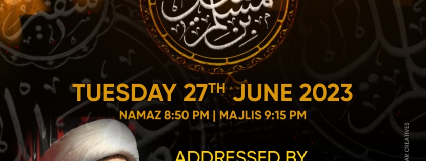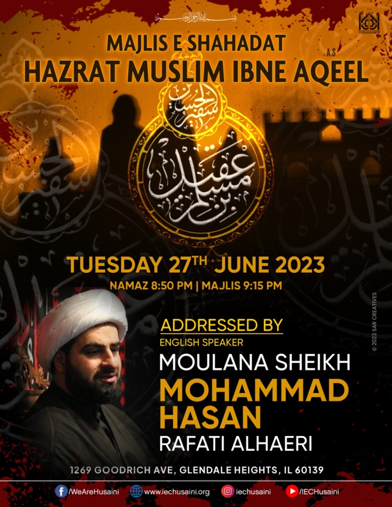 All Events, Featured Events, Key EventsMajlis e Shahadat – Hazrat Muslim Ibne Aqeel Calendar Add to Calendar Add to Timely Calendar Add to Google Add to Outlook Add to Apple Calendar Add to other calendar Export to XML When: 06/27/2023 @ 8:50 PM – 11:50 PM 2023-06-27T20:50:00-05:00 2023-06-27T23:50:00-05:00 All Events Featured Events Key Events 05/12/2023/0 Comments https://www.iechusaini.org/wp-content/uploads/2023/06/WhatsApp-Image-2023-06-22-at-11.55.13-PM.jpeg 1600 1236 Haider Ali https://www.iechusaini.org/wp-content/uploads/2018/12/ie-logo.png Haider Ali2023-05-12 20:03:032023-06-23 07:14:08Majlis e Shahadat – Hazrat Muslim Ibne Aqeel